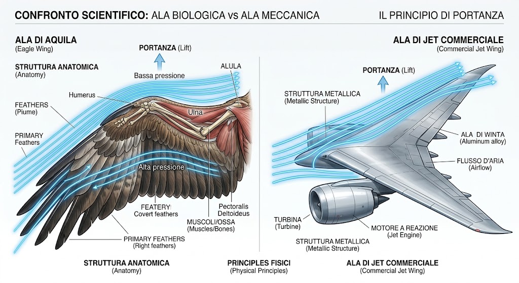 Un uccello è un sistema integrato: l'ala è sia il motore (spinta) che la superficie di sostentamento (portanza). Un jet di linea, invece, ha separato le funzioni. I motori danno la spinta bruta; le ali rigide generano la portanza. Il jet non batte le ali, pesa tonnellate e consuma cherosene, ma vola seguendo le stesse identiche leggi dell'aerodinamica dell'aquila.