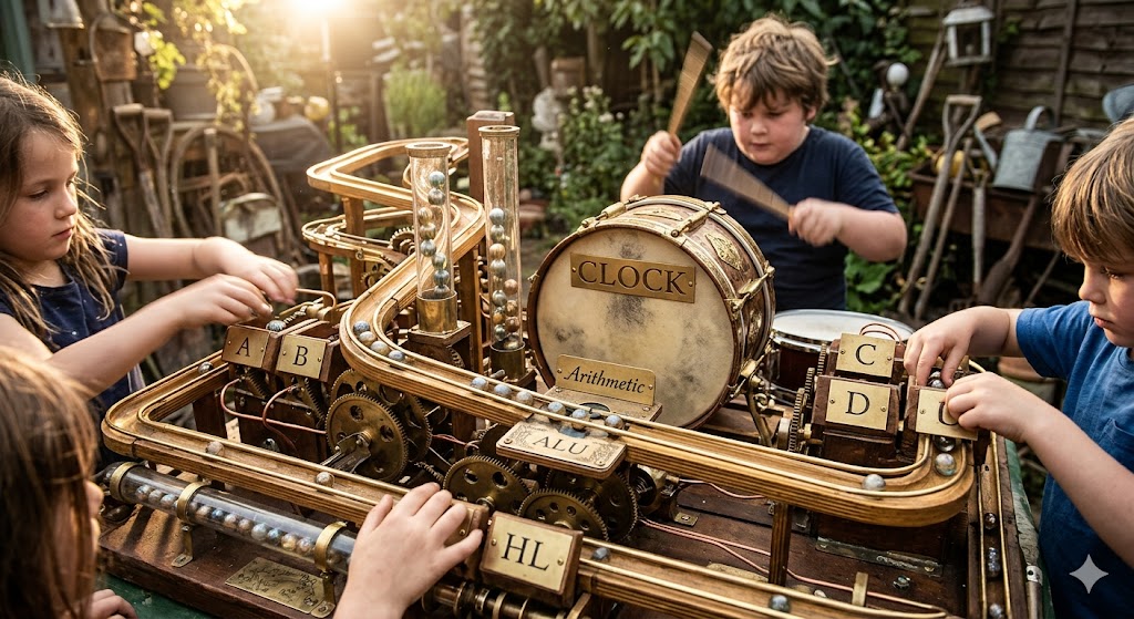 Per capire l'IA dobbiamo tornare alla meccanica pura. Immaginate di spiegare un microprocessore (per motivi di età prendo il leggendario Z80) usando un quarzo (un bambino) che suona un tamburo per dare il tempo, e dei registri (altri bambini) che si scambiano palline da tennis.